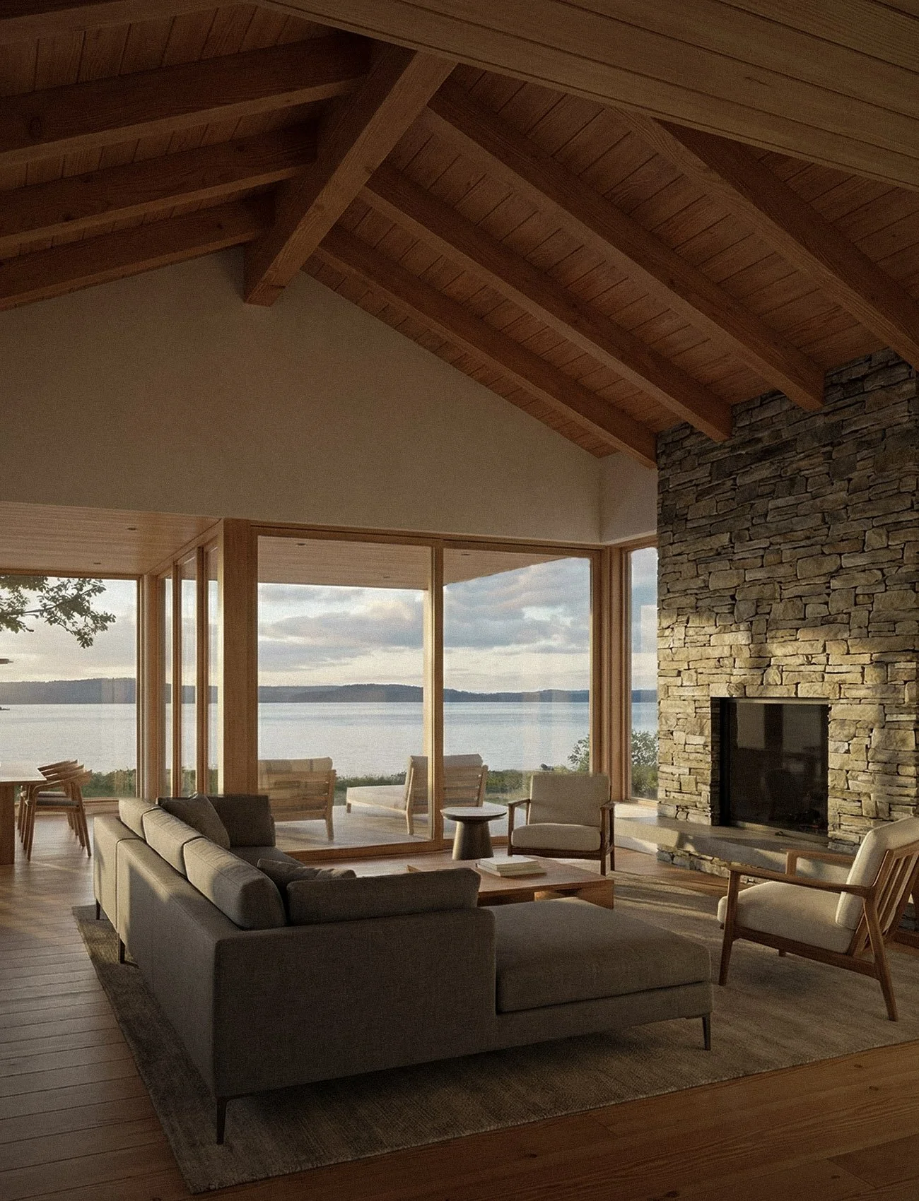 Set within a grove of towering fir trees atop a bluff overlooking a protected cove along Haro Straight on the west side of San Juan Island, this house and art studio was conceived as a modest yet warm family retreat, centered around the act of gathering. A relatively compact site with a dilapidated cabin that sat close to the bluff edge, the location of the replacement dwelling was all but established before the design commenced, due to the restrictive nature of local shoreline land-use codes. Working with the existing footprint and prioritizing the spectacular setting and views, the new home was organized around an airy central space at the promontory of the site that housed the main living and gathering spaces, while the more private spaces spread to either side, maintaining views and connection to the land while also offering refuge. The art studio is tucked behind the house with framed views toward the open meadow beyond.